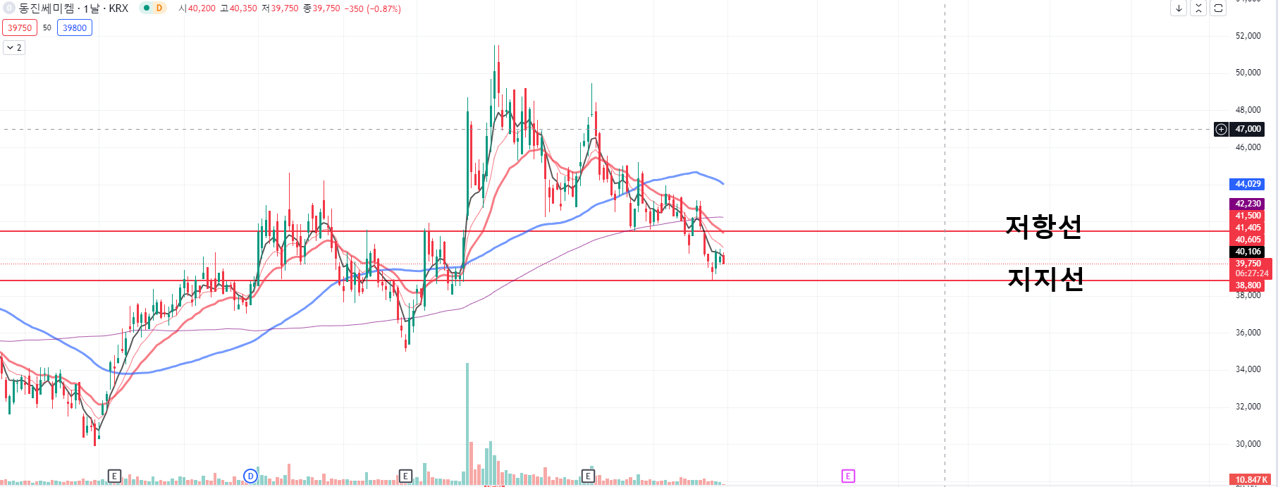 기술적 분석에 따르면, 단기적으로는 40,250원에서 지지를 받고 있으며,