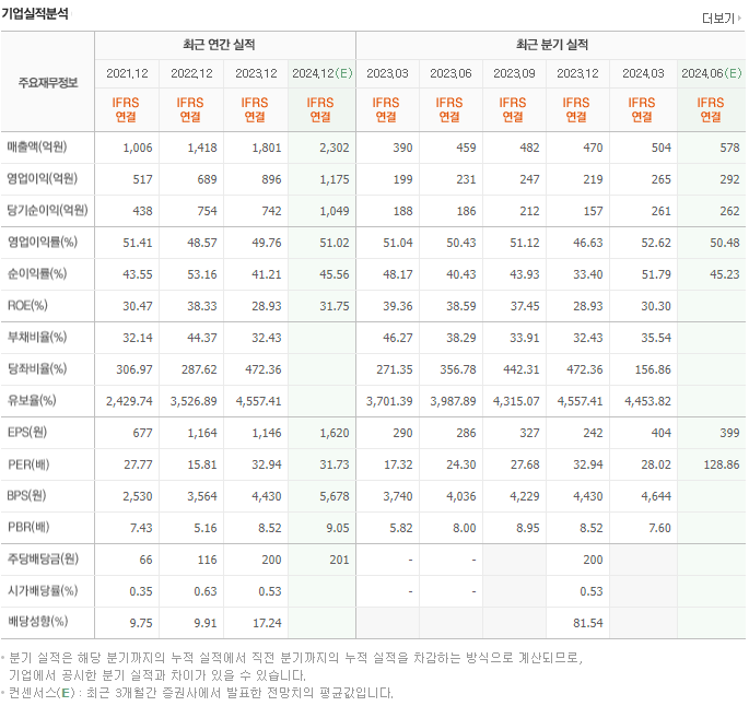 2024년 3월 기준 매출액은 전년 대비 29.3% 증가한 1,801억 원, 영업이익은 33.3% 증가한 896억 원,